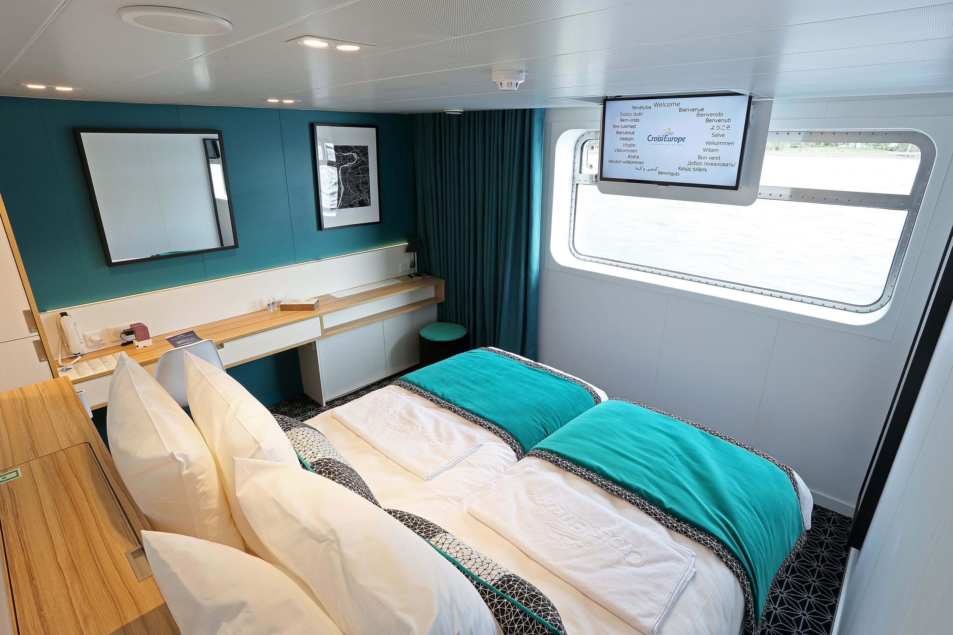 This modern ship, built in 2016, is comparable to a 4* hotel, and can accommodate 77 passengers in 39 cabins spread across two decks.