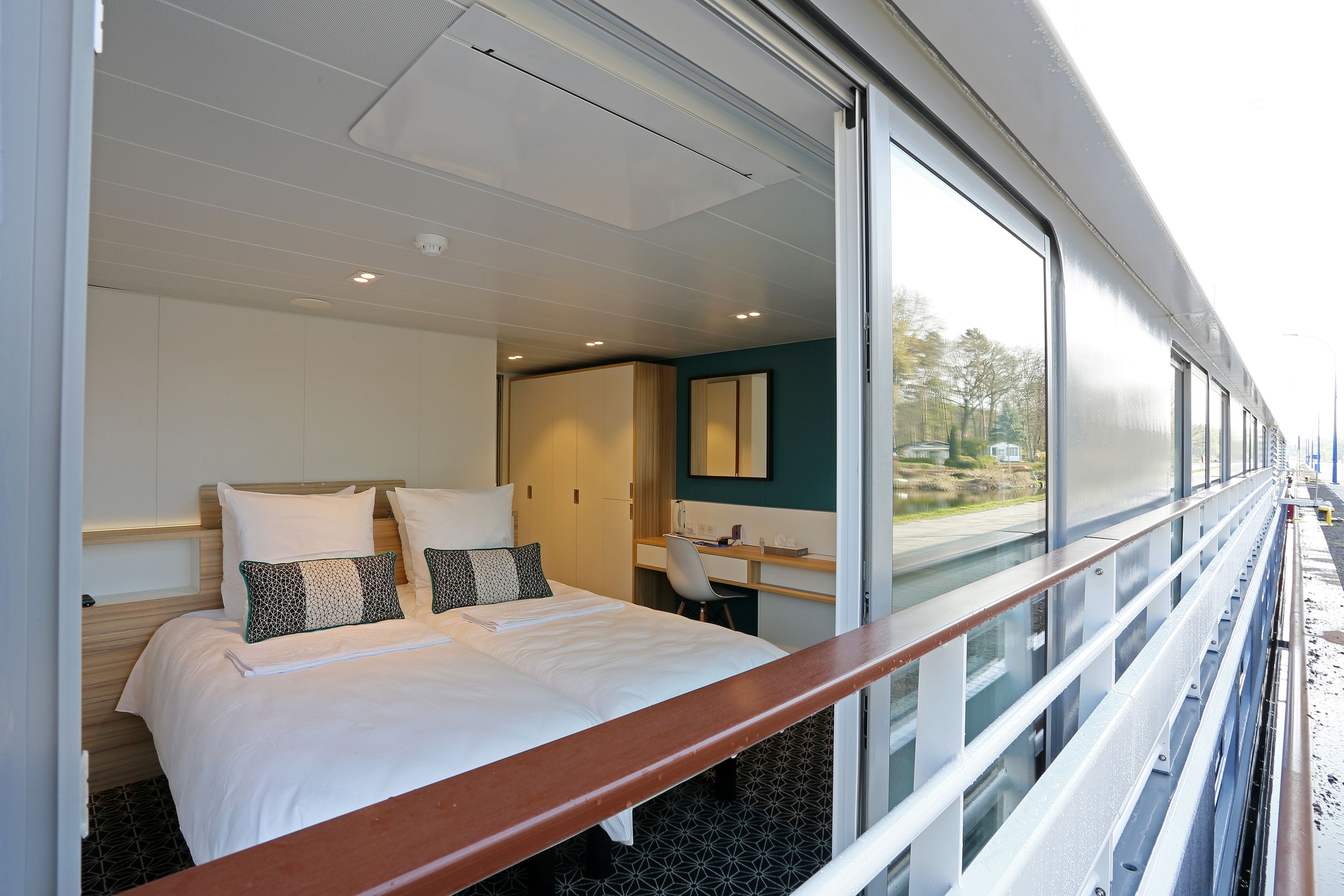 Upper Deck Outside Cabins – Twin/double air-conditioned cabin with a French balcony, sliding windows, 14.5 m² in size.