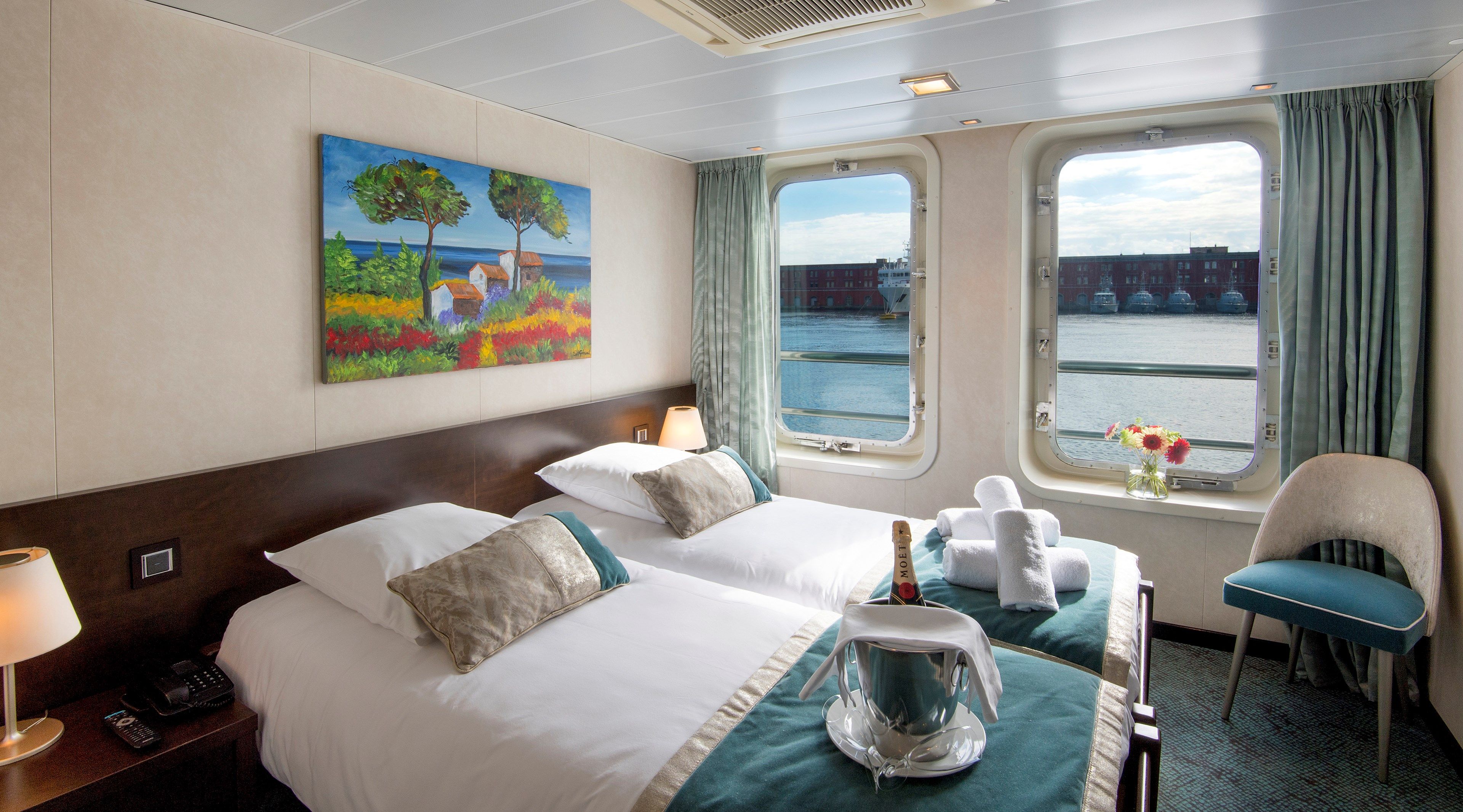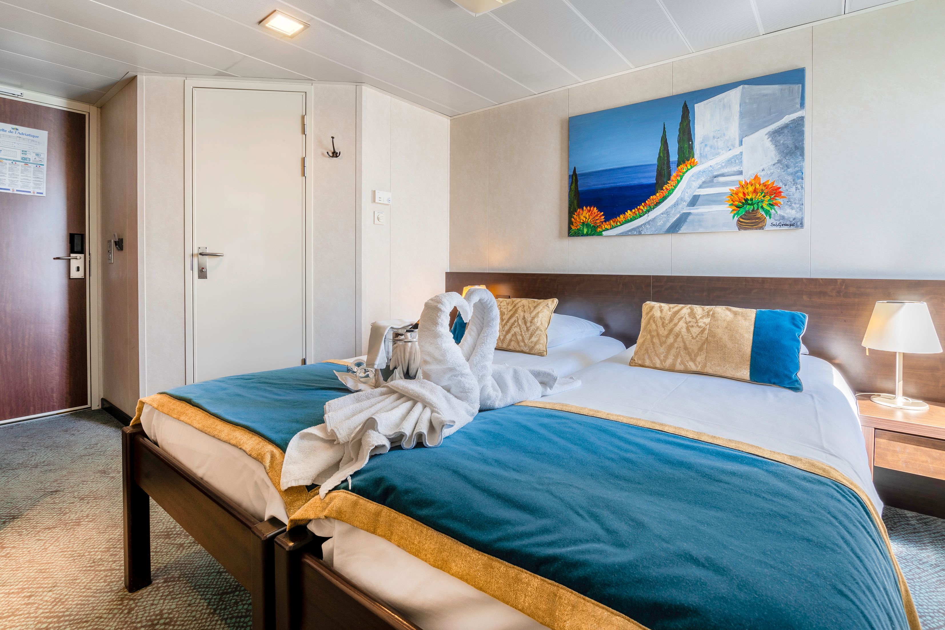 Embarkation Deck Outside Cabins – Twin/double air-conditioned cabin with a panoramic window, 10.5 or 11.5m² in size. Please call for upgrade supplement.